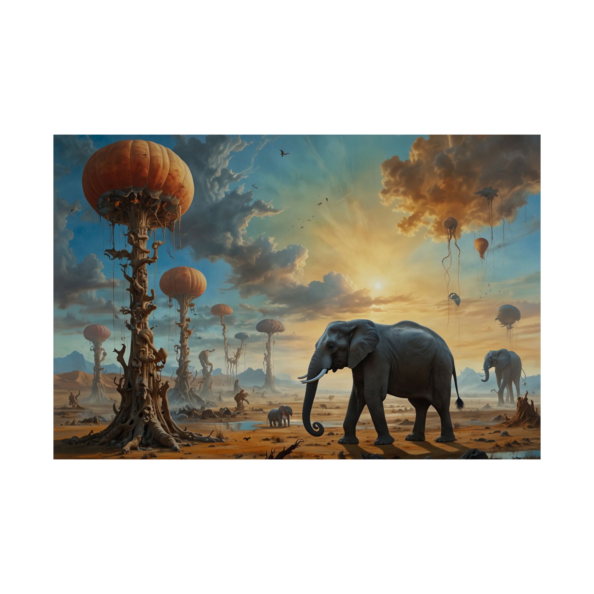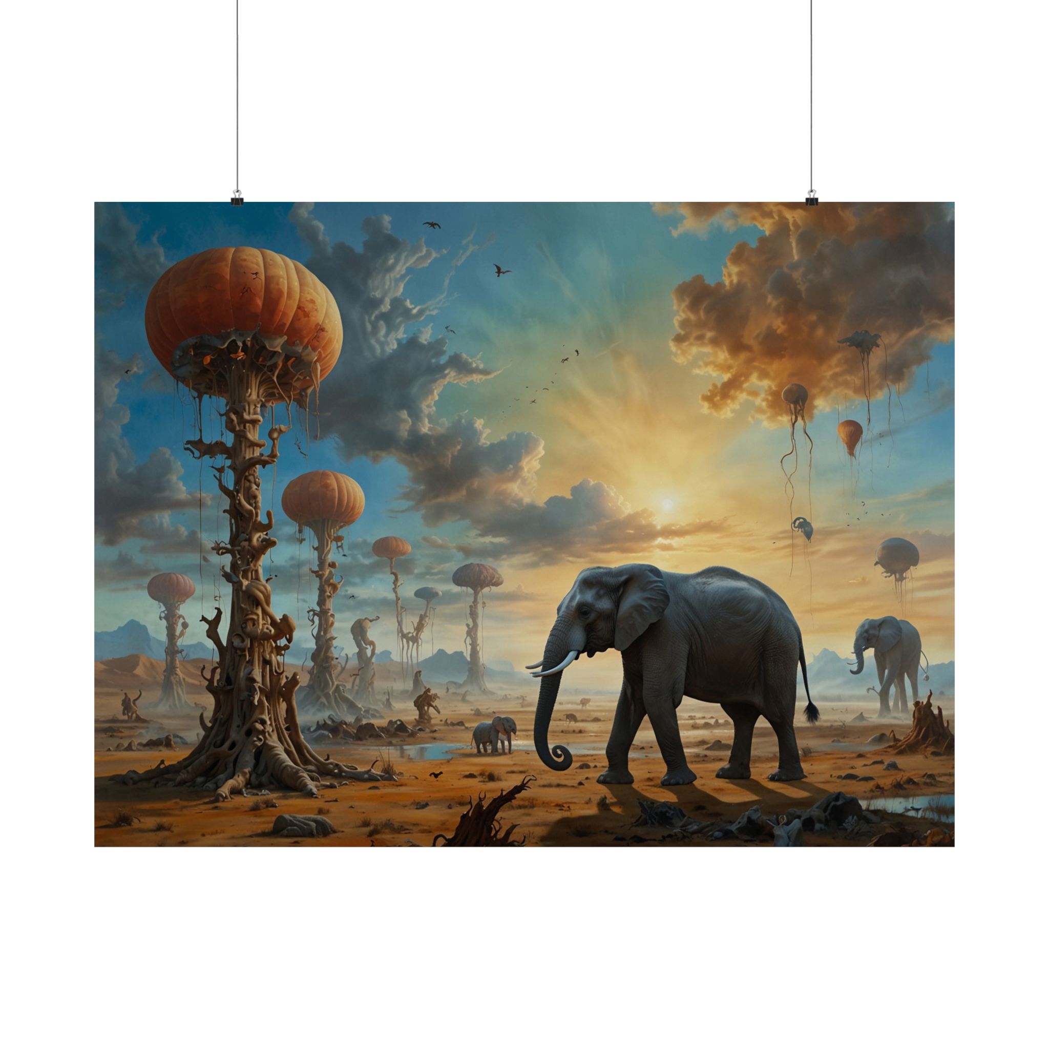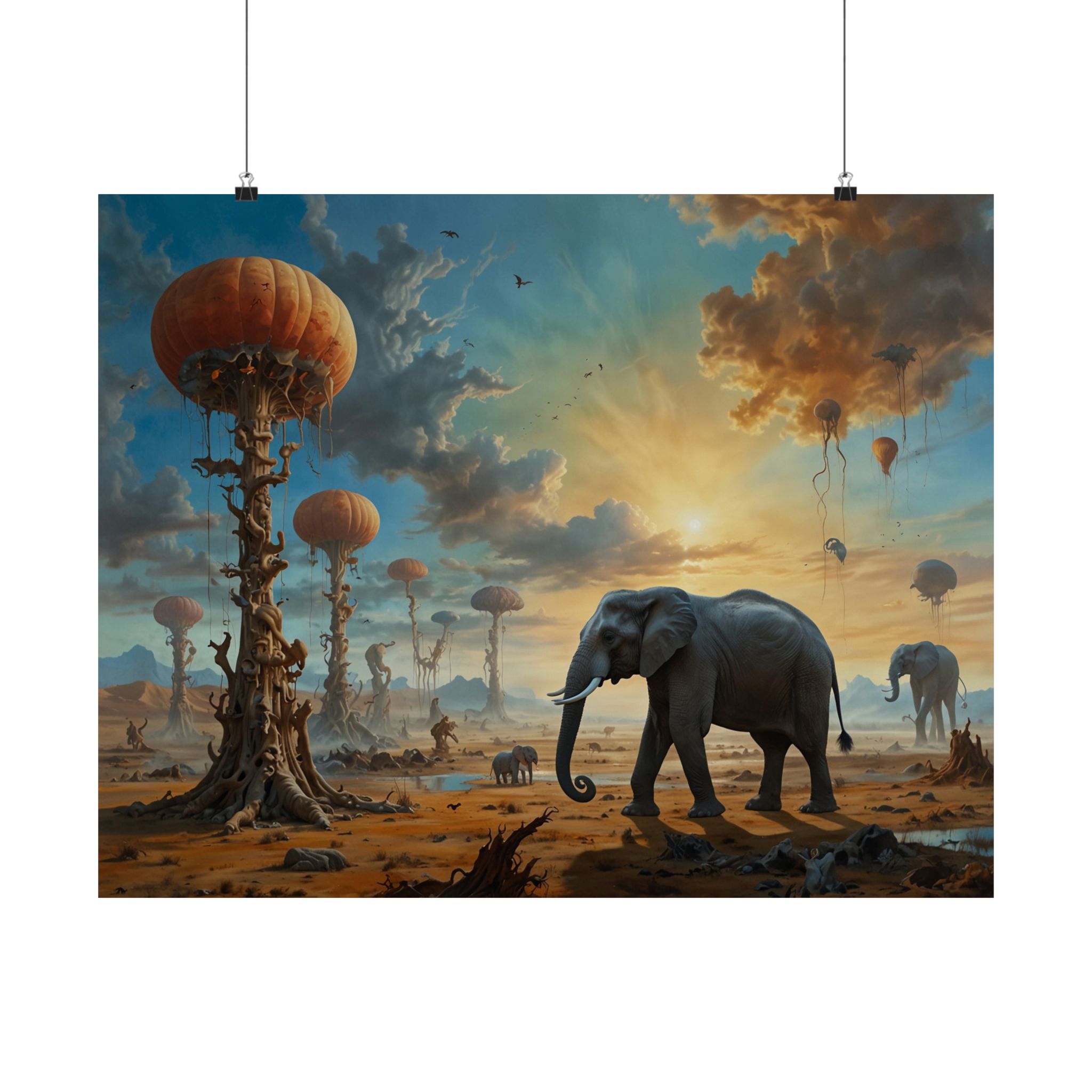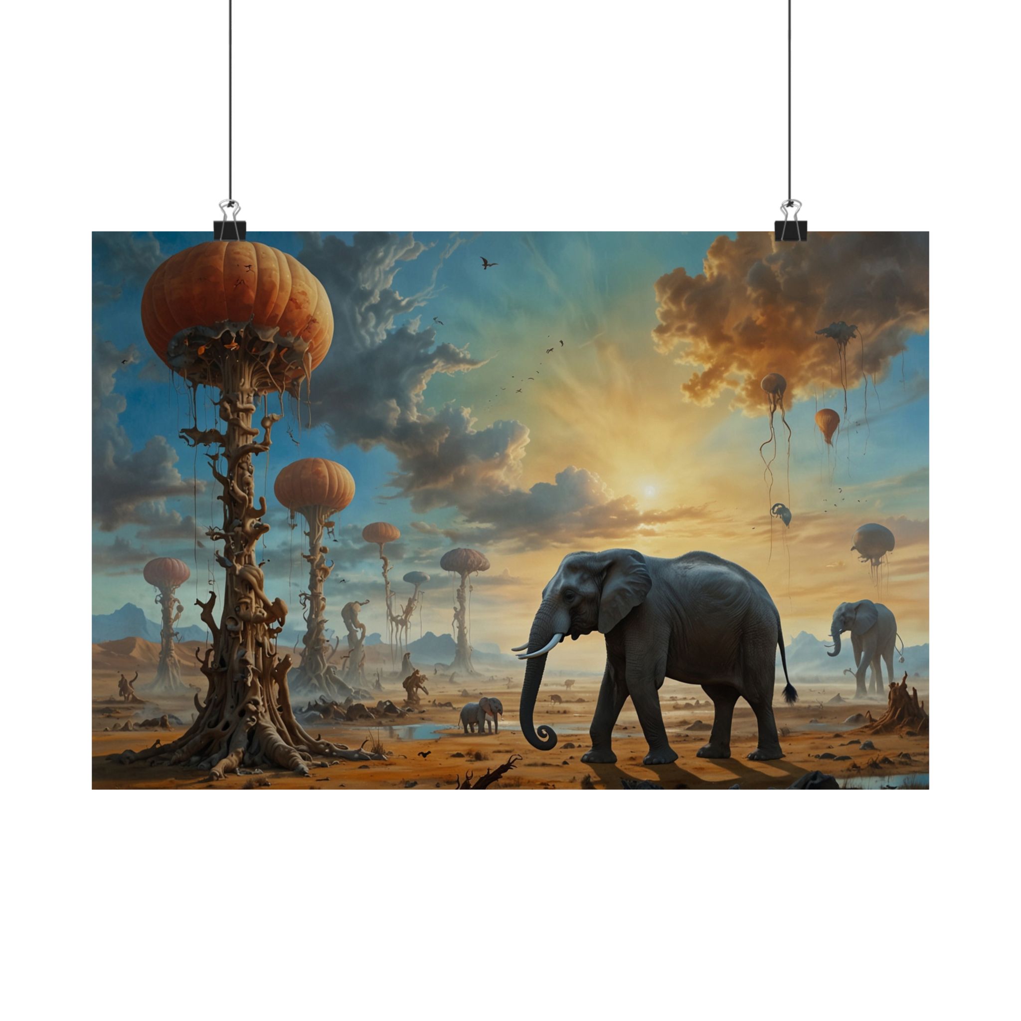 “Elephants and Pumpkin Tree Balloon Beings” – Matte Poster – in the Style of Salvador Dali