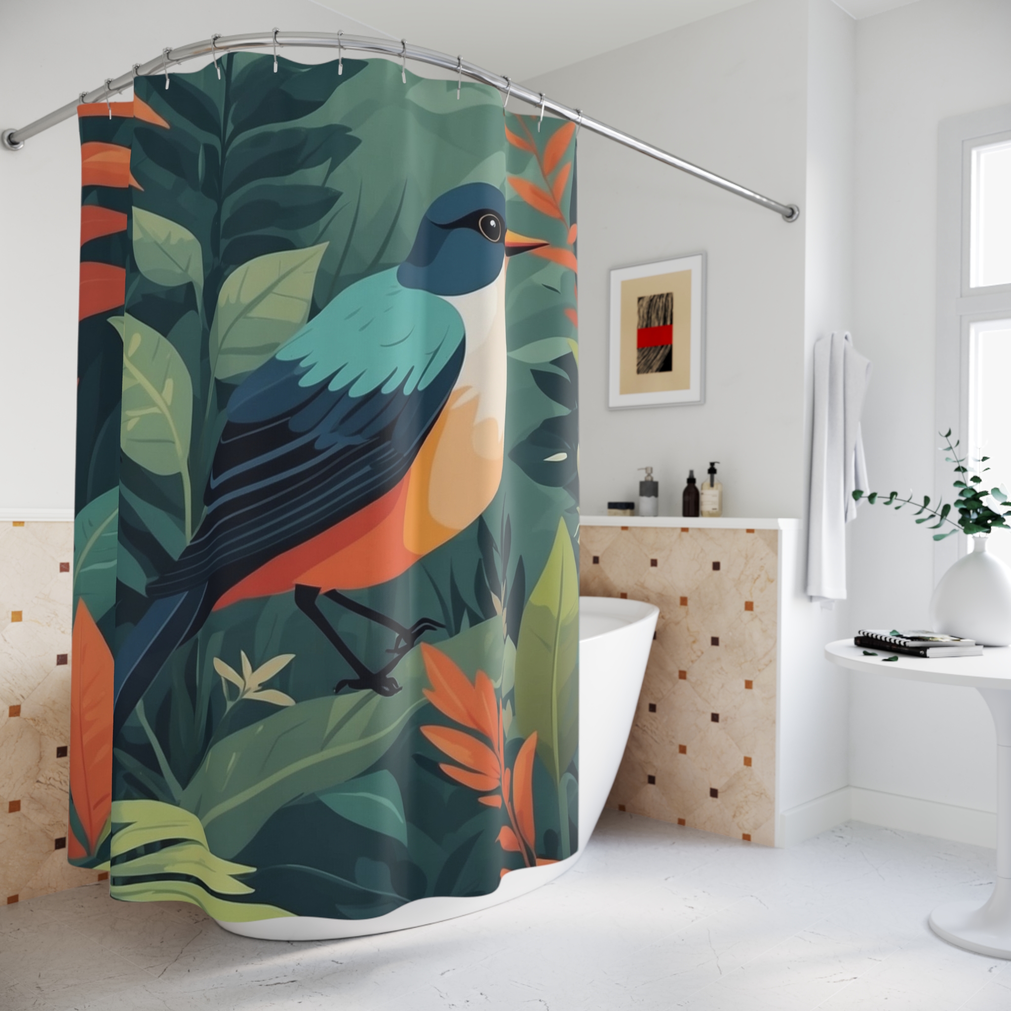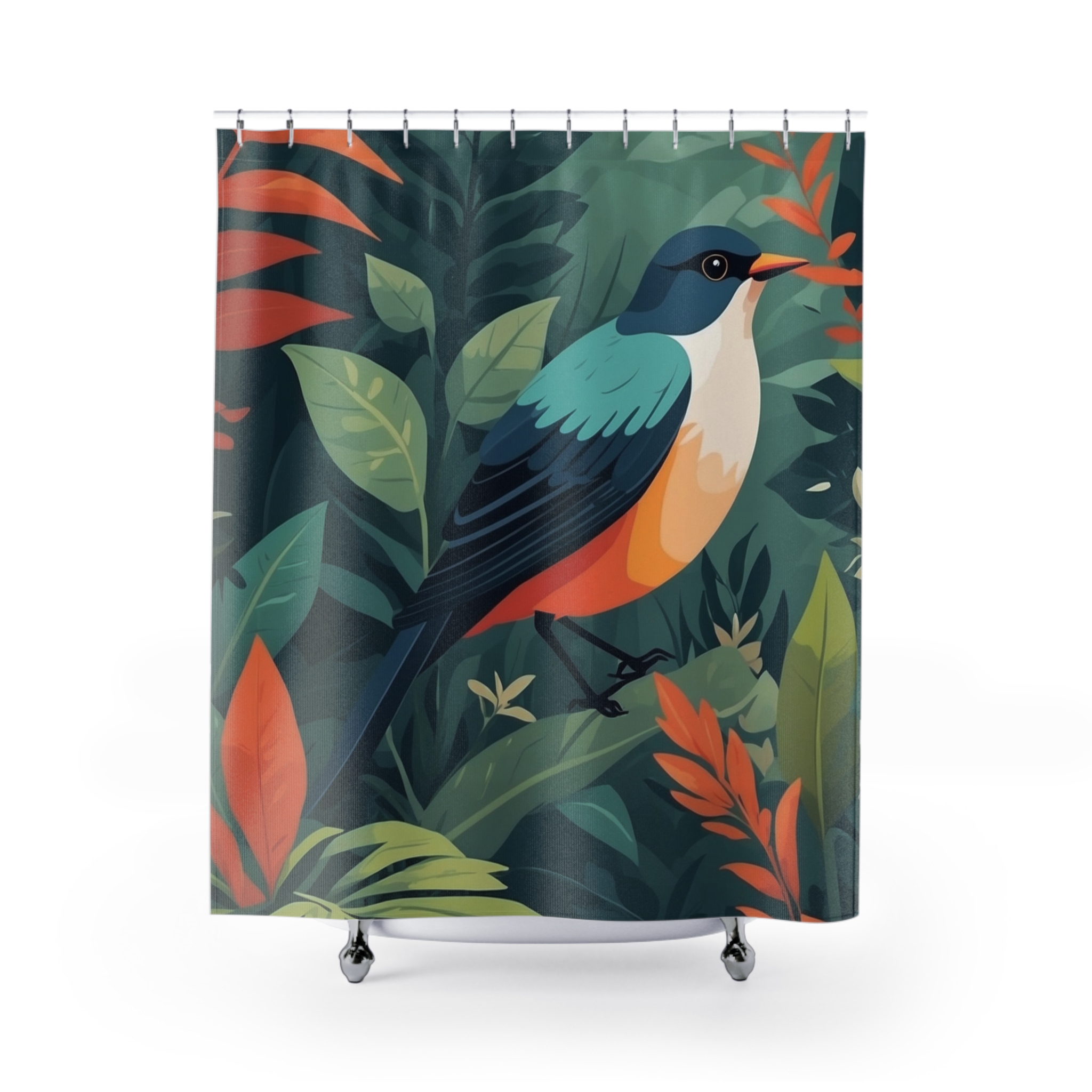Elevate Your Bathroom with the Vibrant “Jungle Bird” Shower Curtain