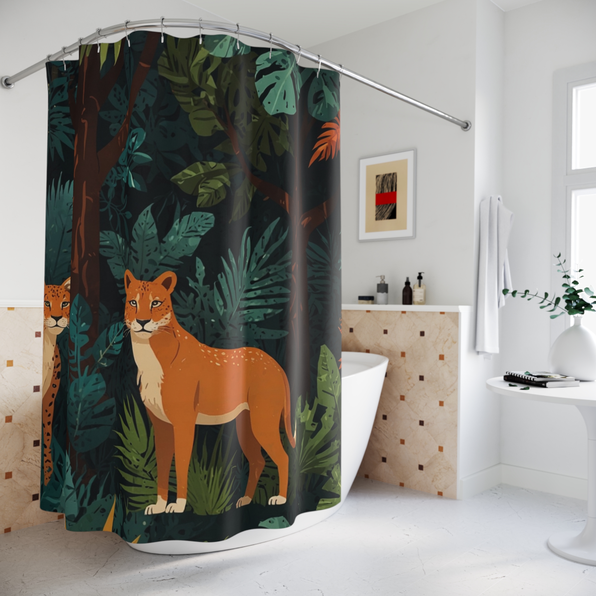 Add a touch of wild elegance to your bathroom with our unique “Jungle Cats” illustration designed shower curtain. This vibrant and playful design features colorful jungle cats amidst lush greenery, creating a fun and eye-catching look that’s sure to delight.