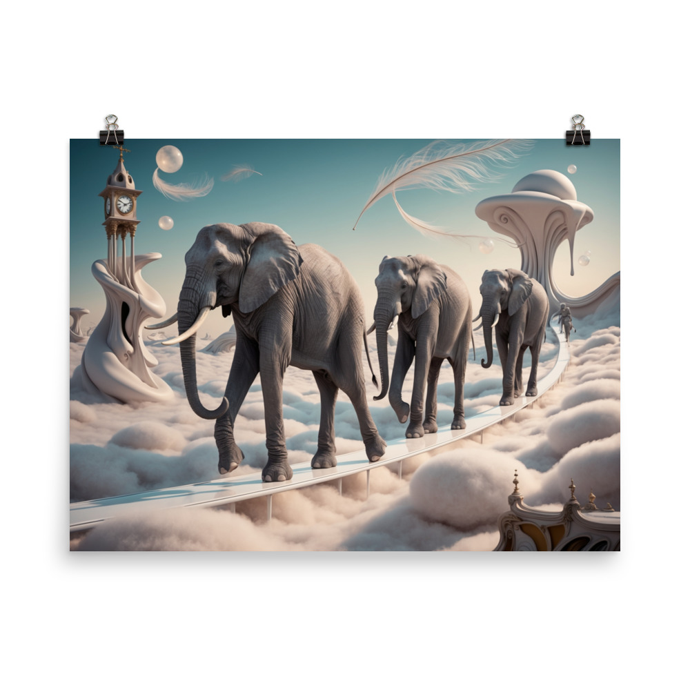 Elephants in Cloud City Poster – Dali-Inspired Surrealist Art