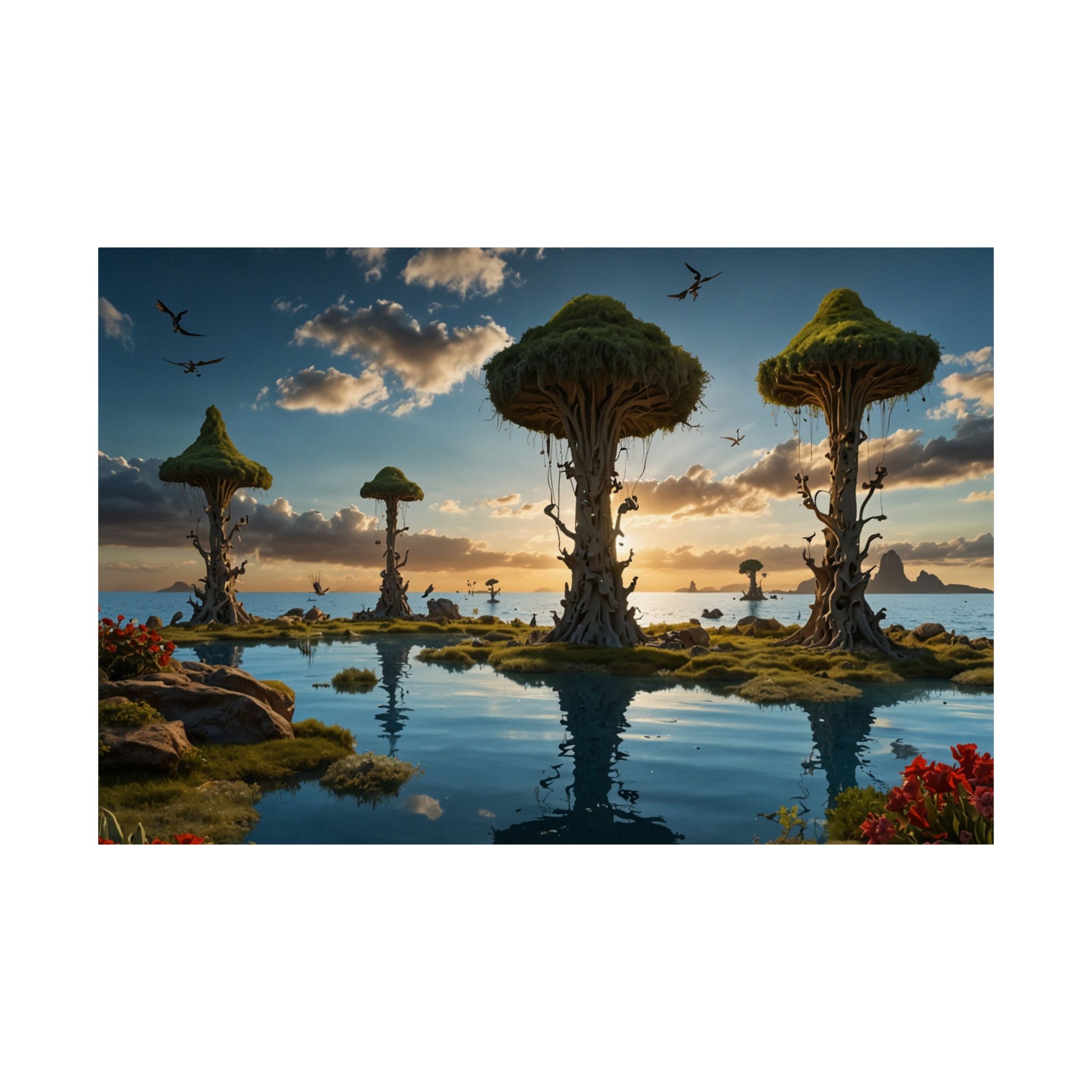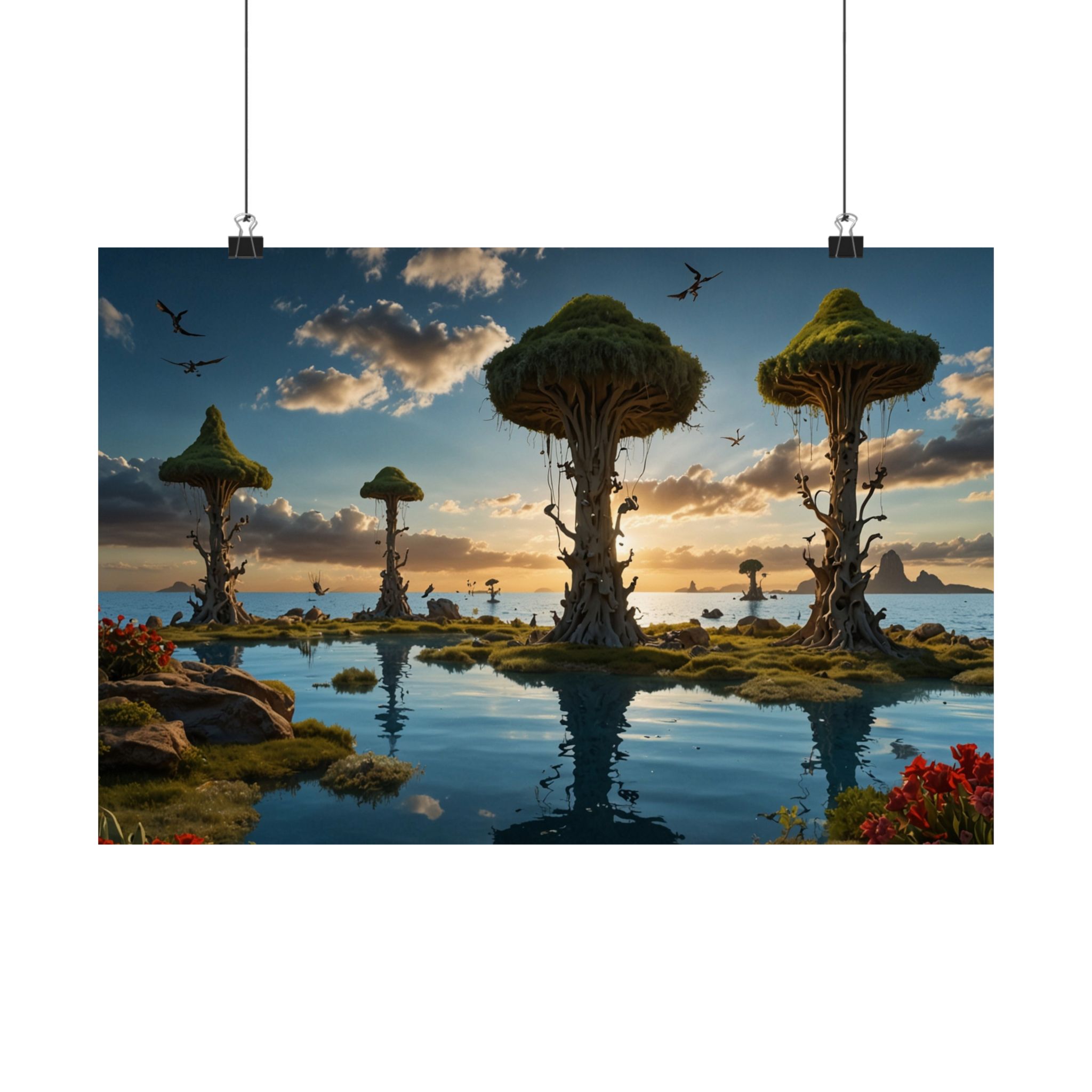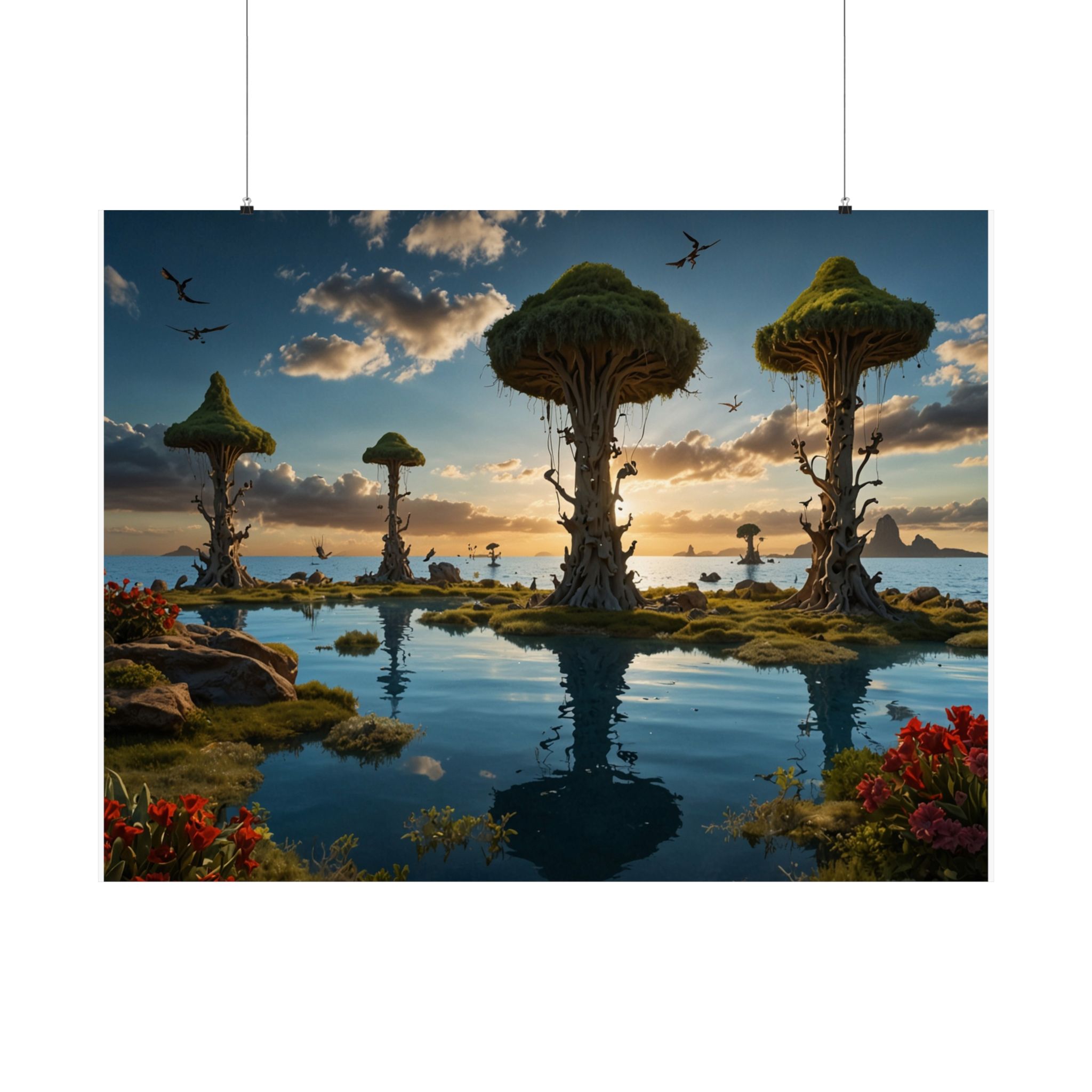 Add a touch of the extraordinary to your walls with the “Setting Sun Pre-Historic Lagoon” matte poster. This captivating artwork will transport you to a world of wonder and awe, where the boundaries between reality and dreams are blurred. Perfect for those who appreciate the surreal and the unknown, this poster is sure to inspire and delight.