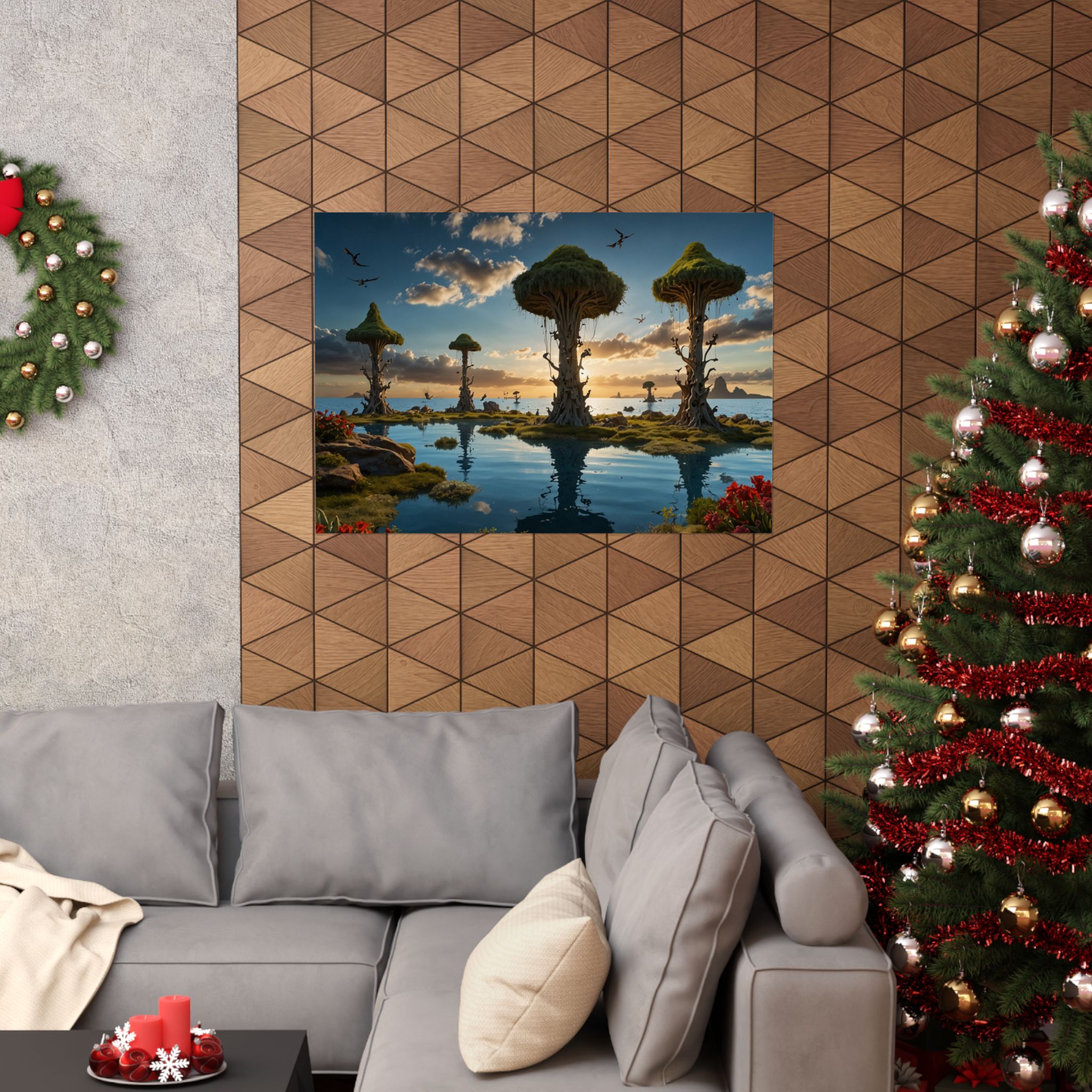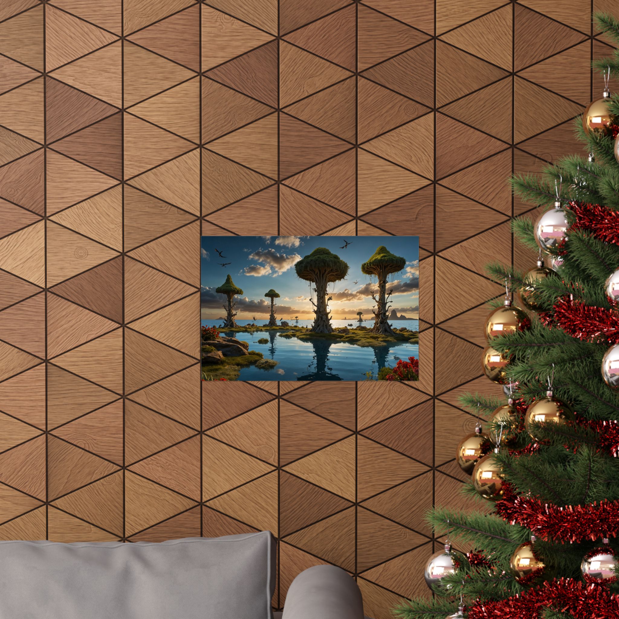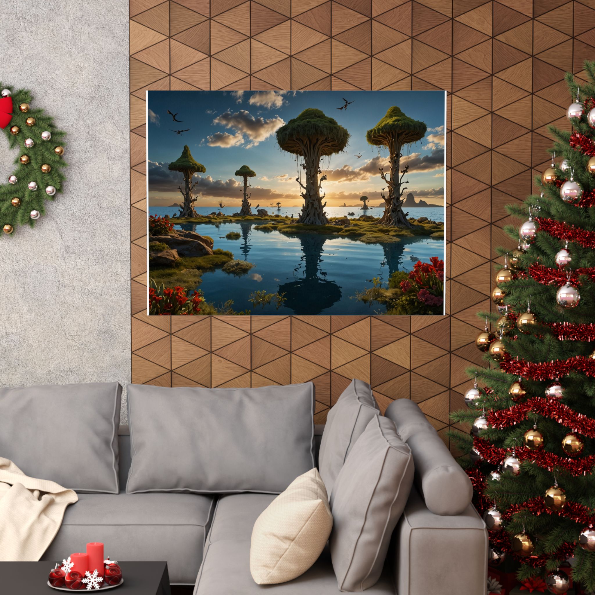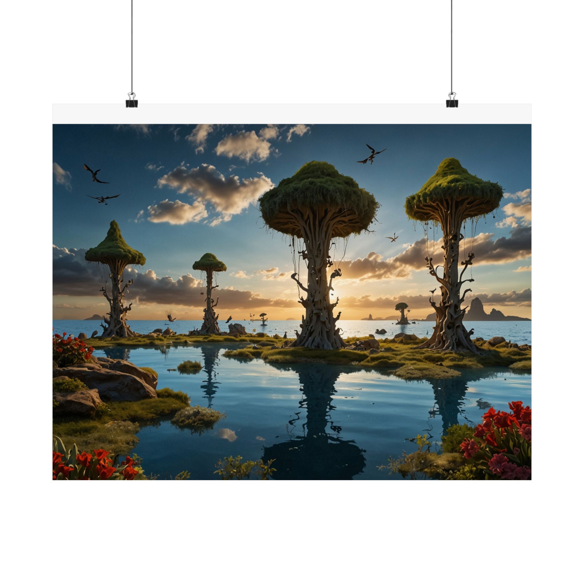 Add a touch of the extraordinary to your walls with the “Setting Sun Pre-Historic Lagoon” matte poster. This captivating artwork will transport you to a world of wonder and awe, where the boundaries between reality and dreams are blurred. Perfect for those who appreciate the surreal and the unknown, this poster is sure to inspire and delight.