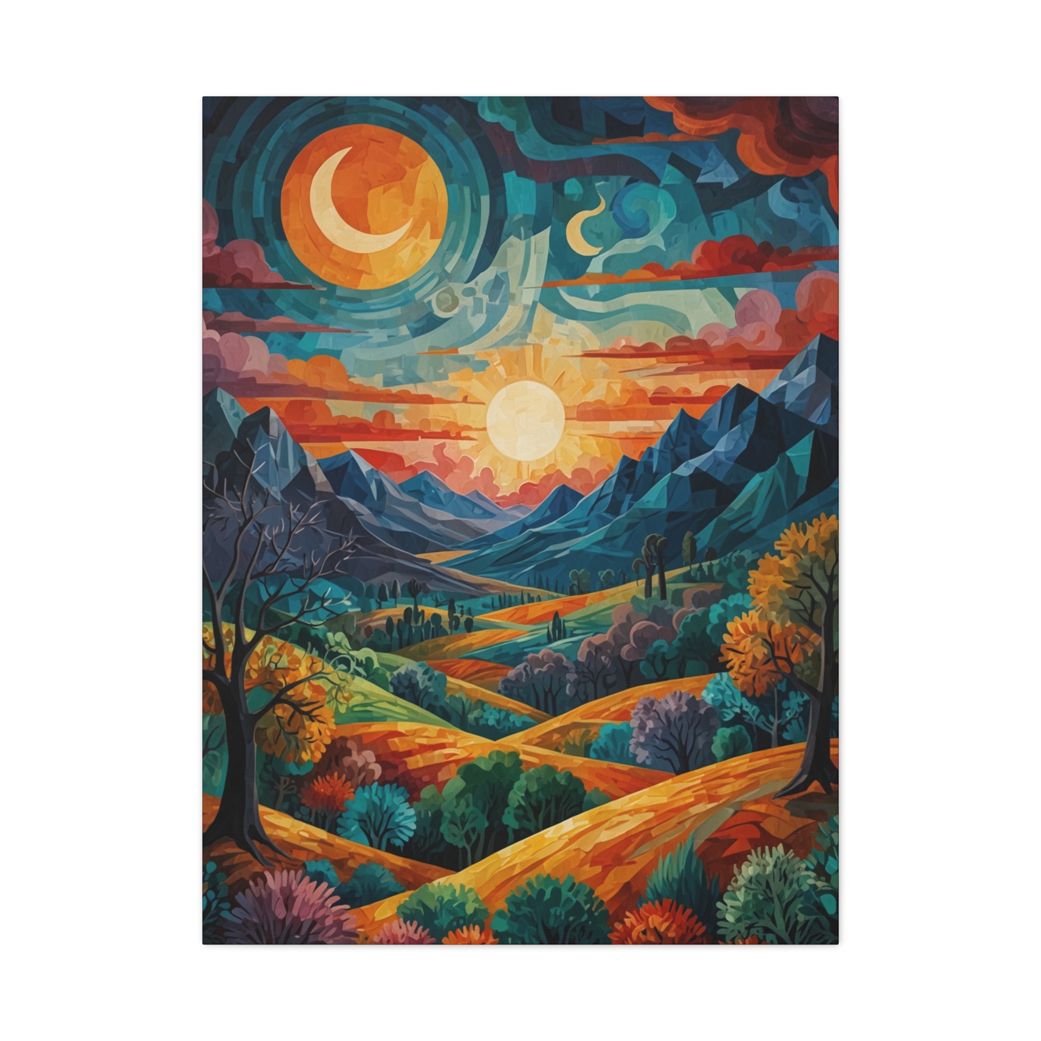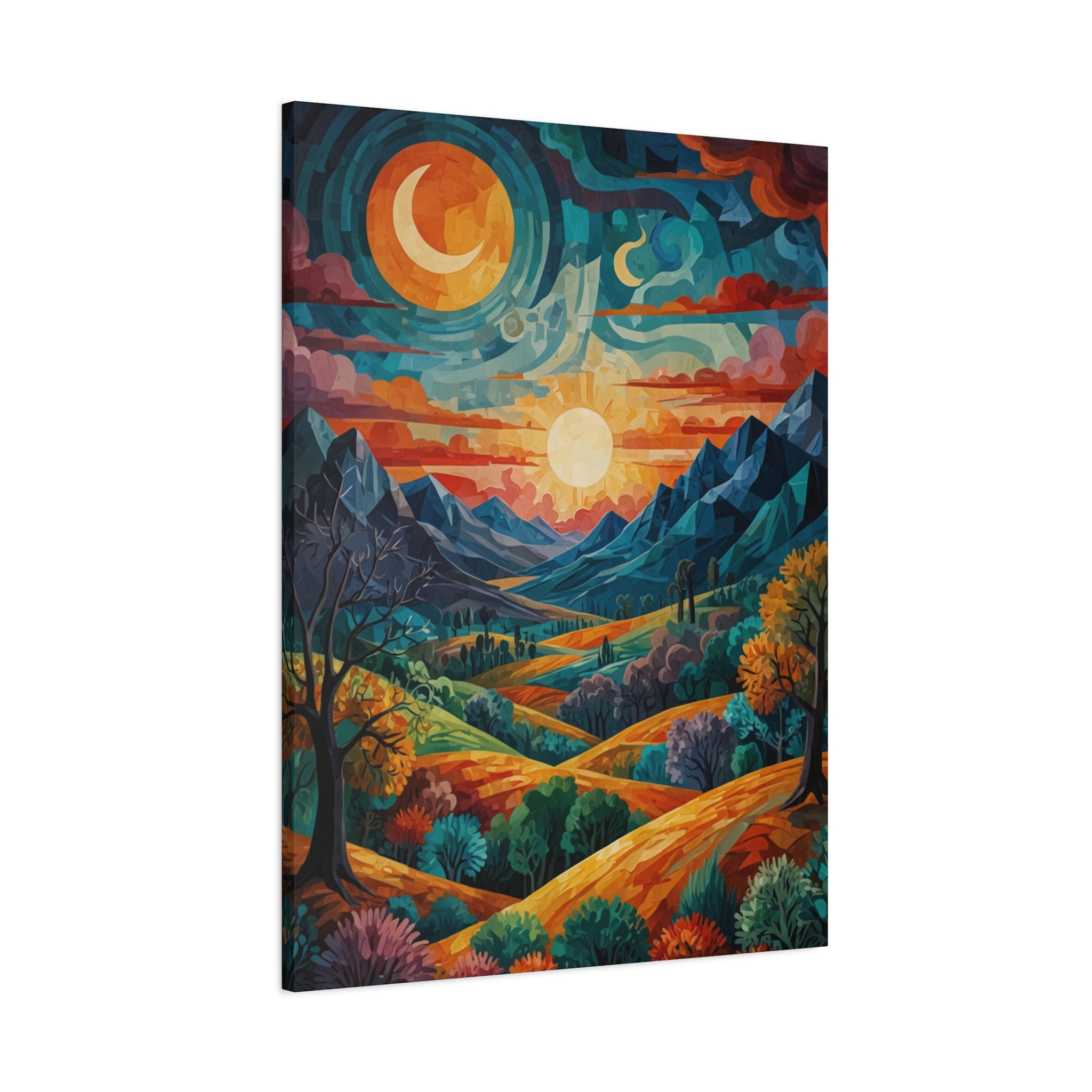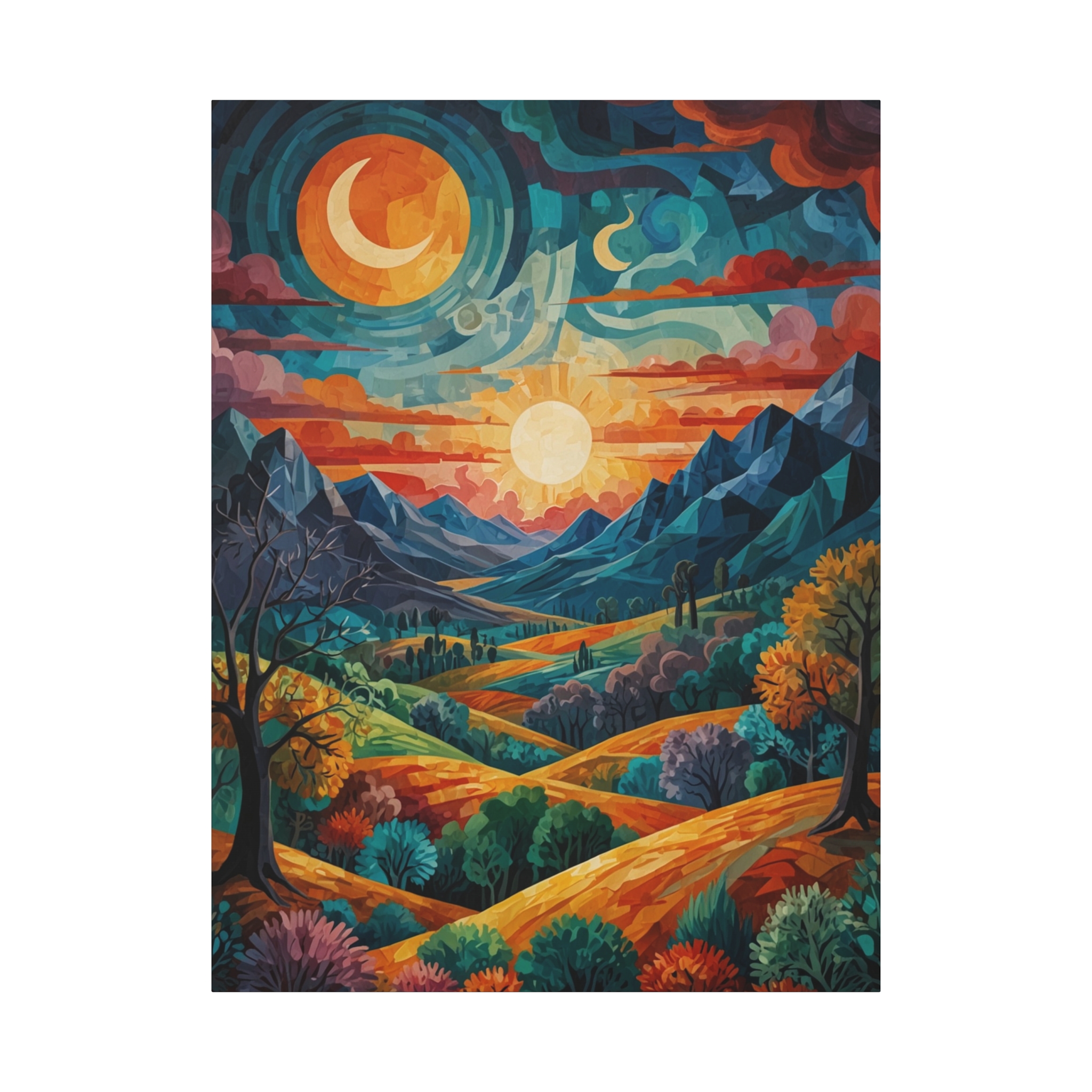 Surreal Landscape: A dreamlike landscape with abstract trees and mountains, where the sun and moon coexist in a twisted sky – in Pablo Picasso style. Transform your space with the enchanting allure of “Surreal Landscape,” a captivating piece that invites you to explore the depths of imagination and dreamlike beauty. This stunning artwork is printed on high-quality matte canvas, ensuring vibrant colors and striking detail that will elevate any room’s aesthetic.