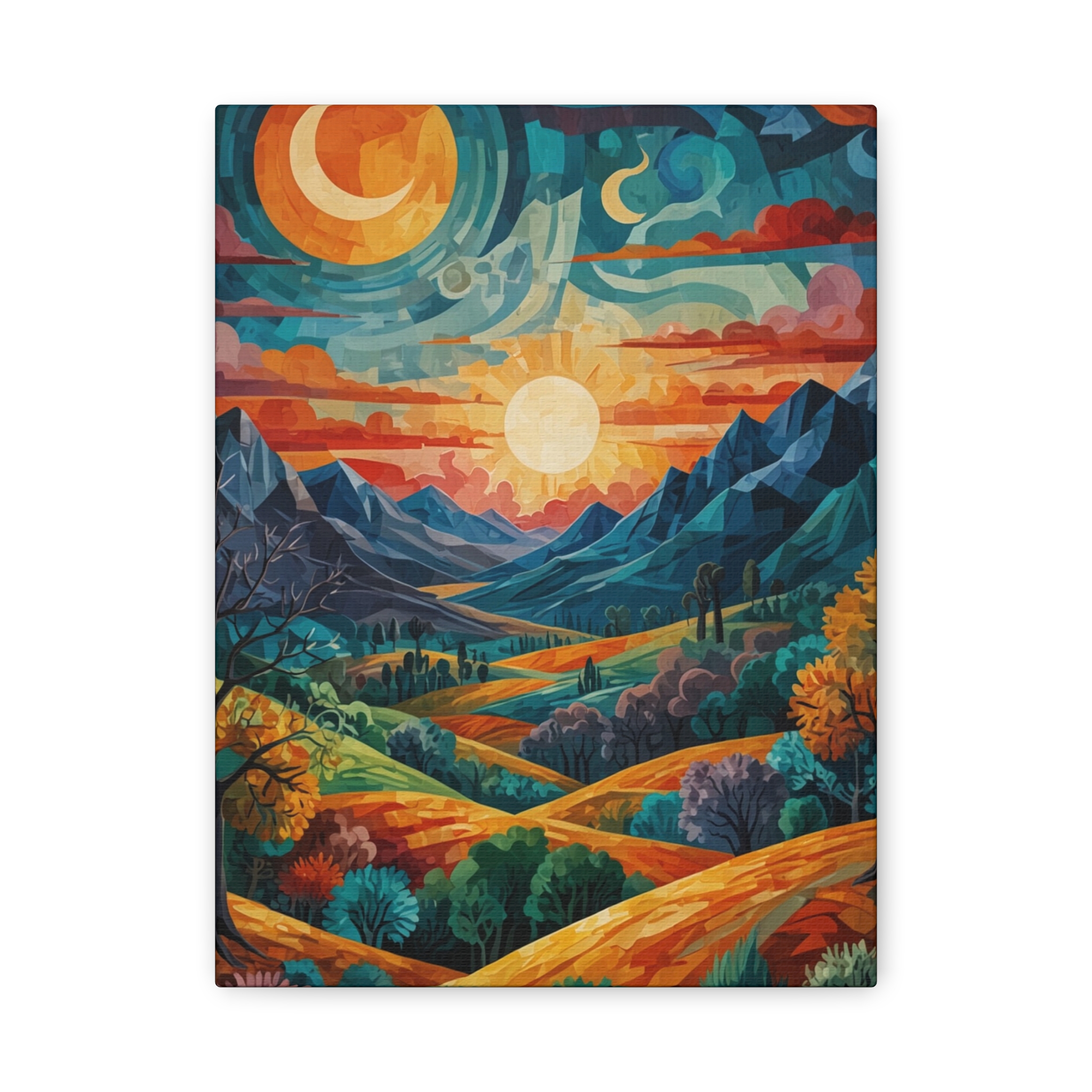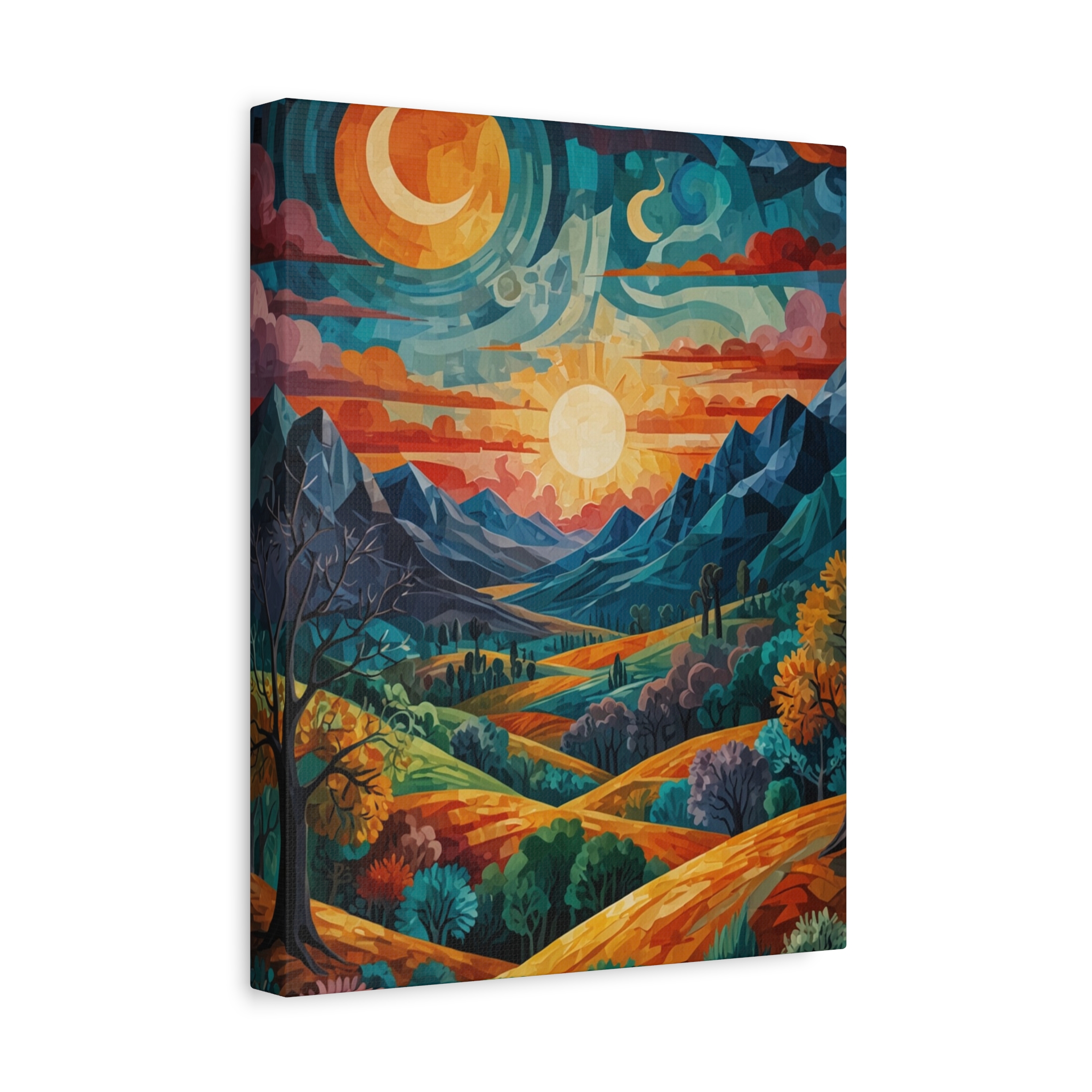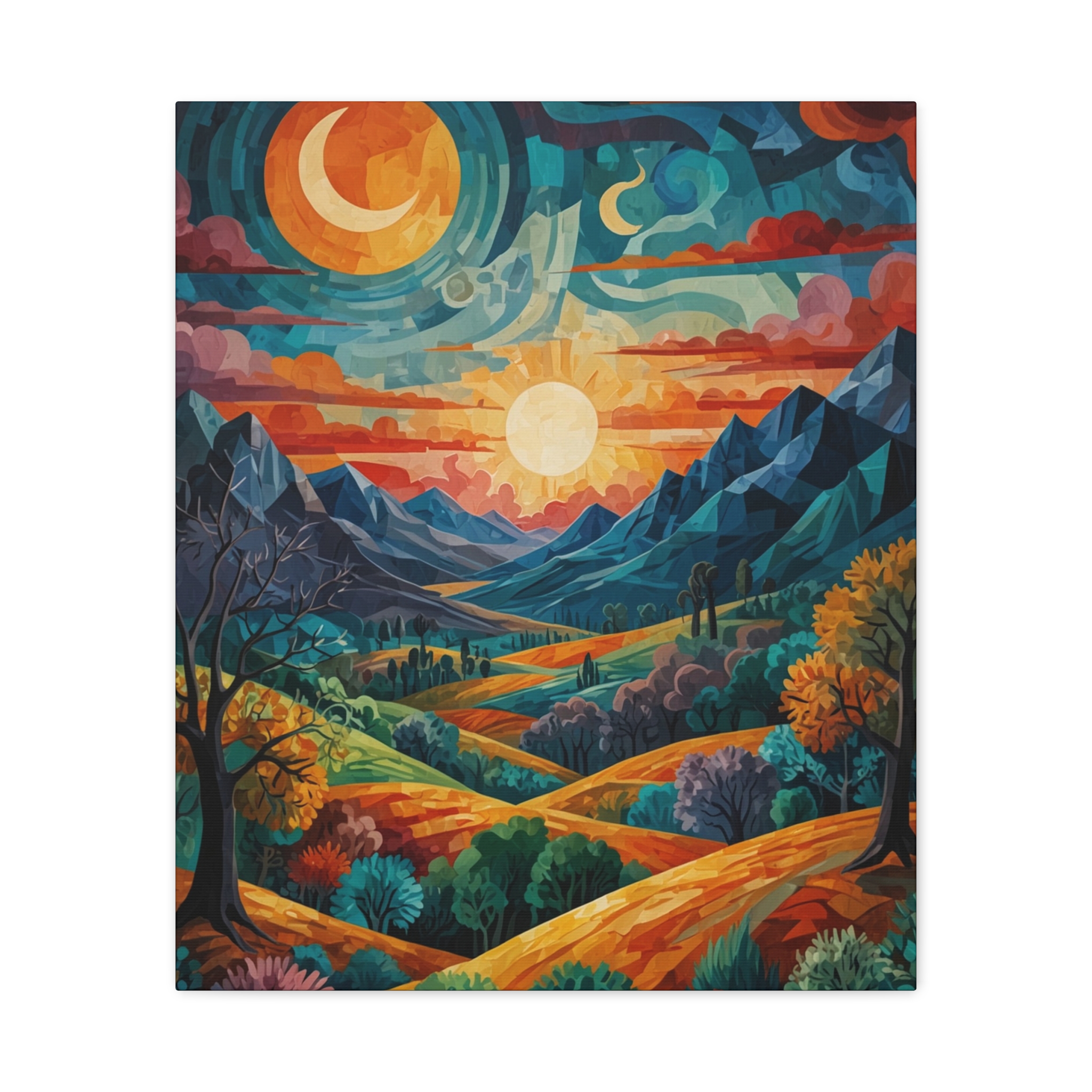 Surreal Landscape: A dreamlike landscape with abstract trees and mountains, where the sun and moon coexist in a twisted sky – in Pablo Picasso style. Transform your space with the enchanting allure of “Surreal Landscape,” a captivating piece that invites you to explore the depths of imagination and dreamlike beauty. This stunning artwork is printed on high-quality matte canvas, ensuring vibrant colors and striking detail that will elevate any room’s aesthetic.