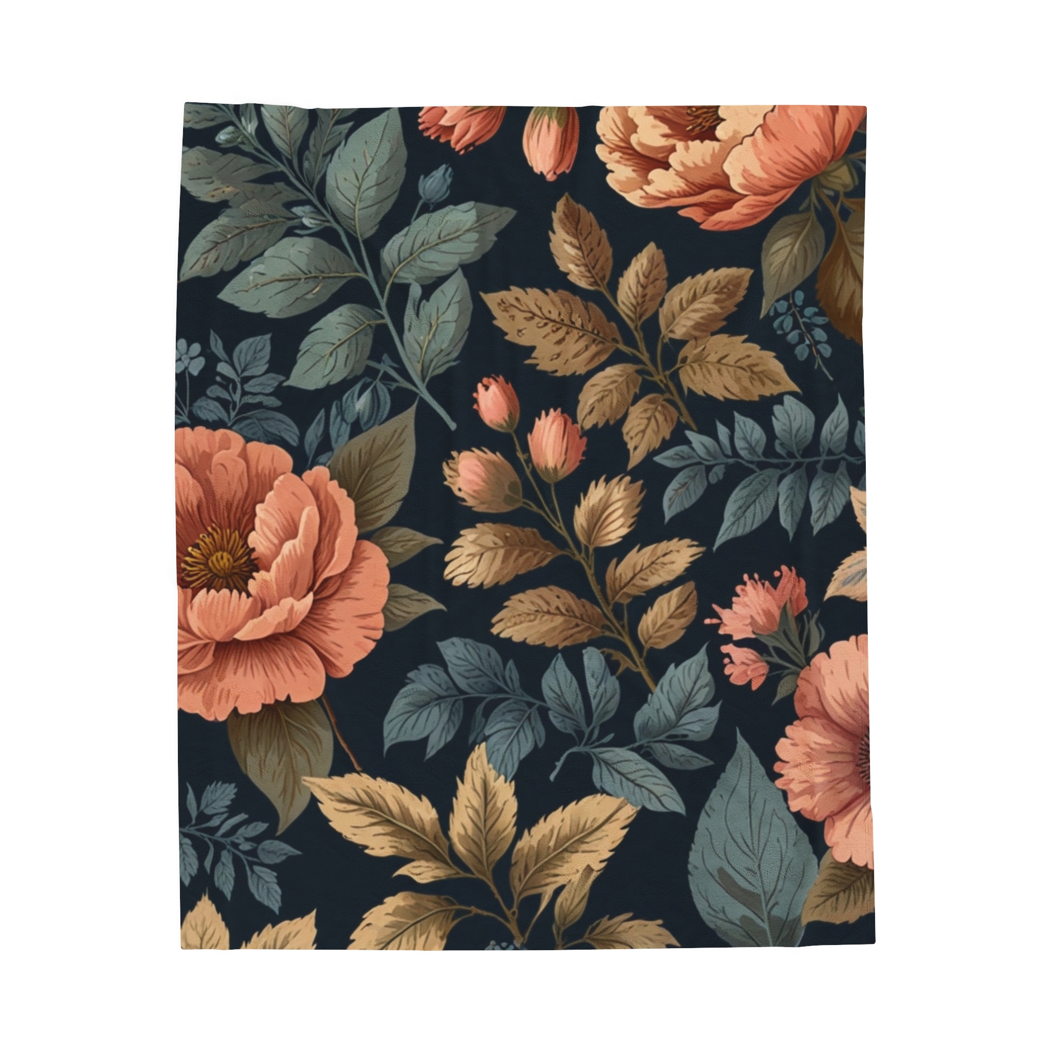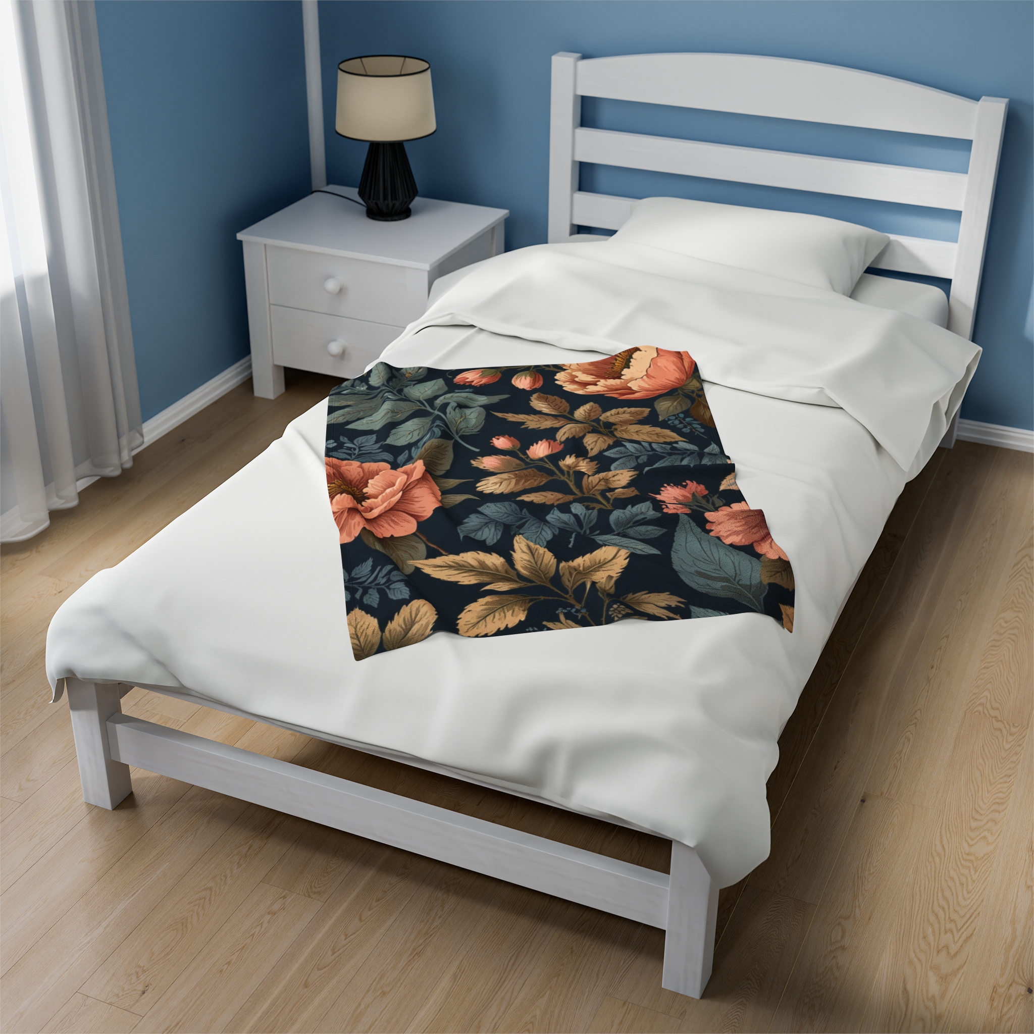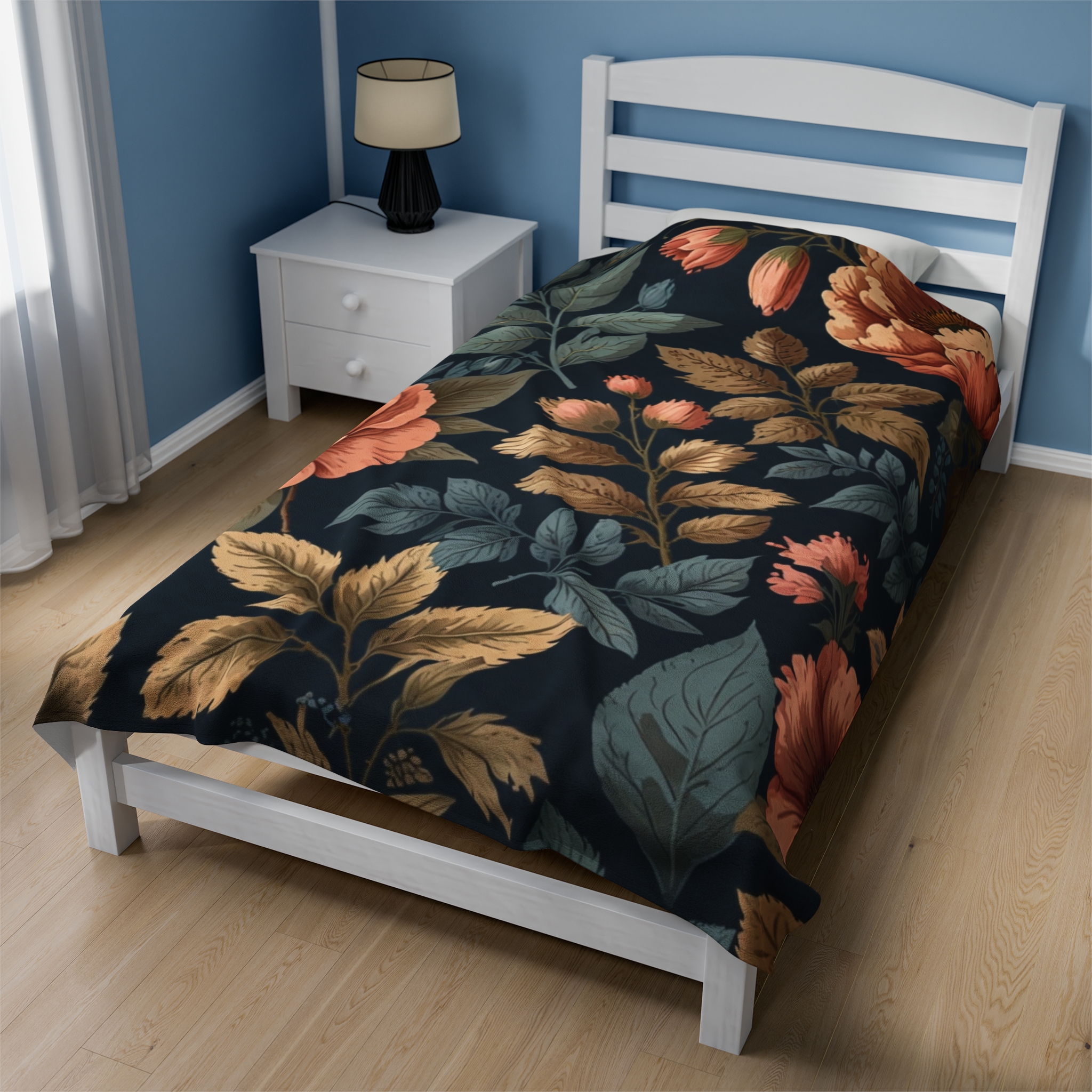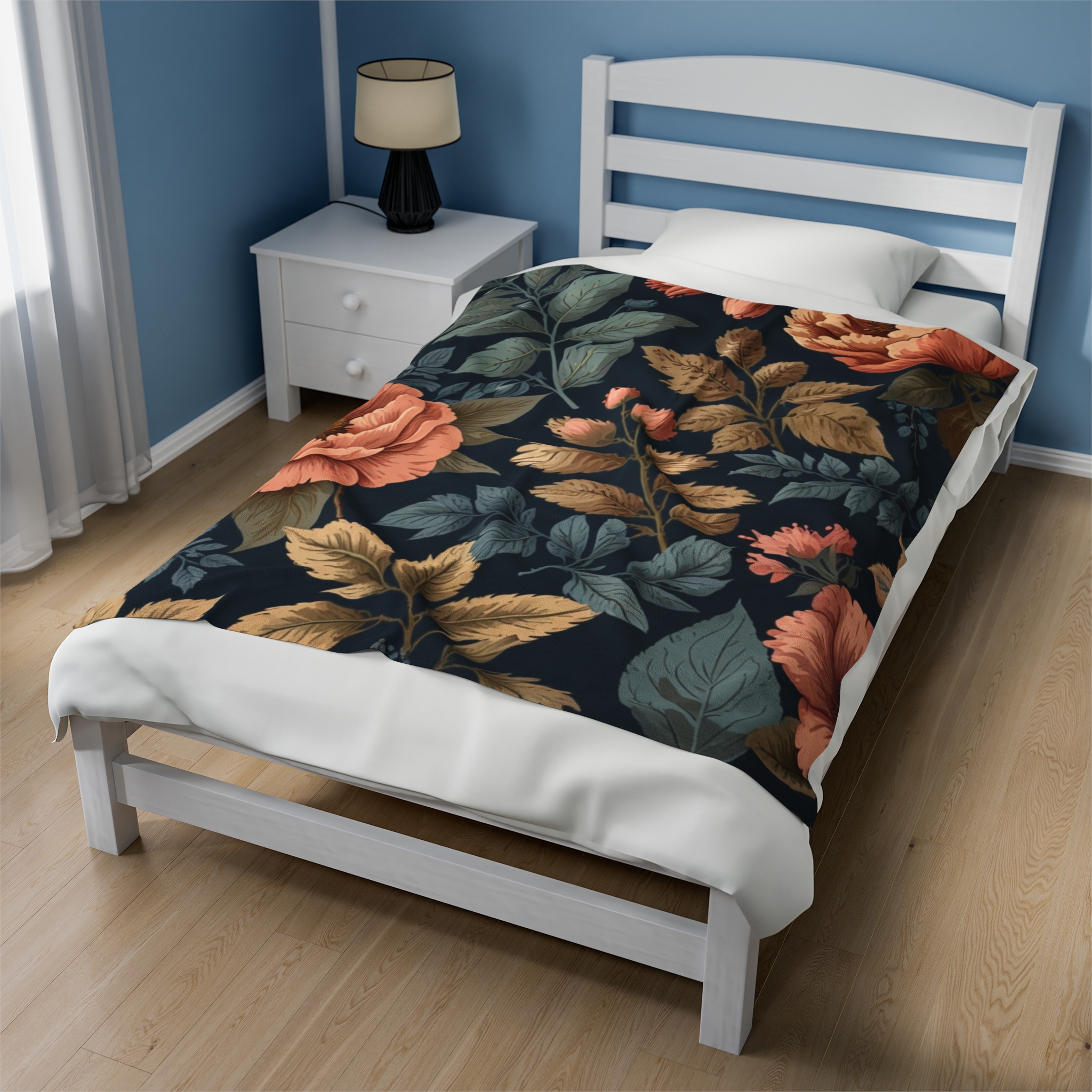 Velveteen Plush Blanket – “Gold, Green Leaves, Peach Flowers ” Design