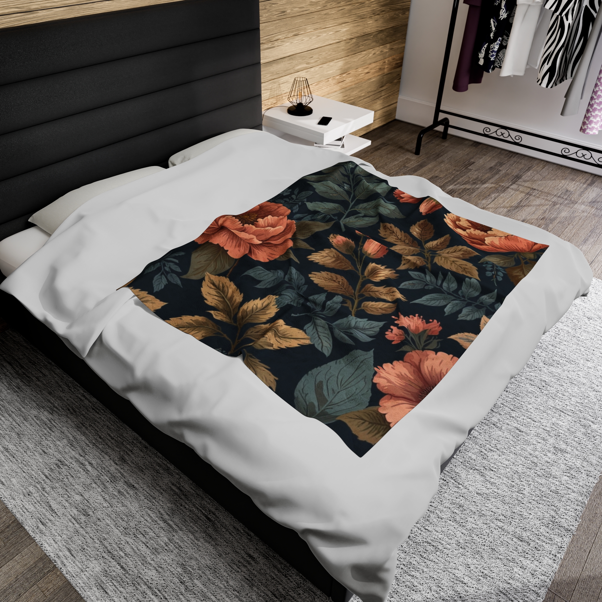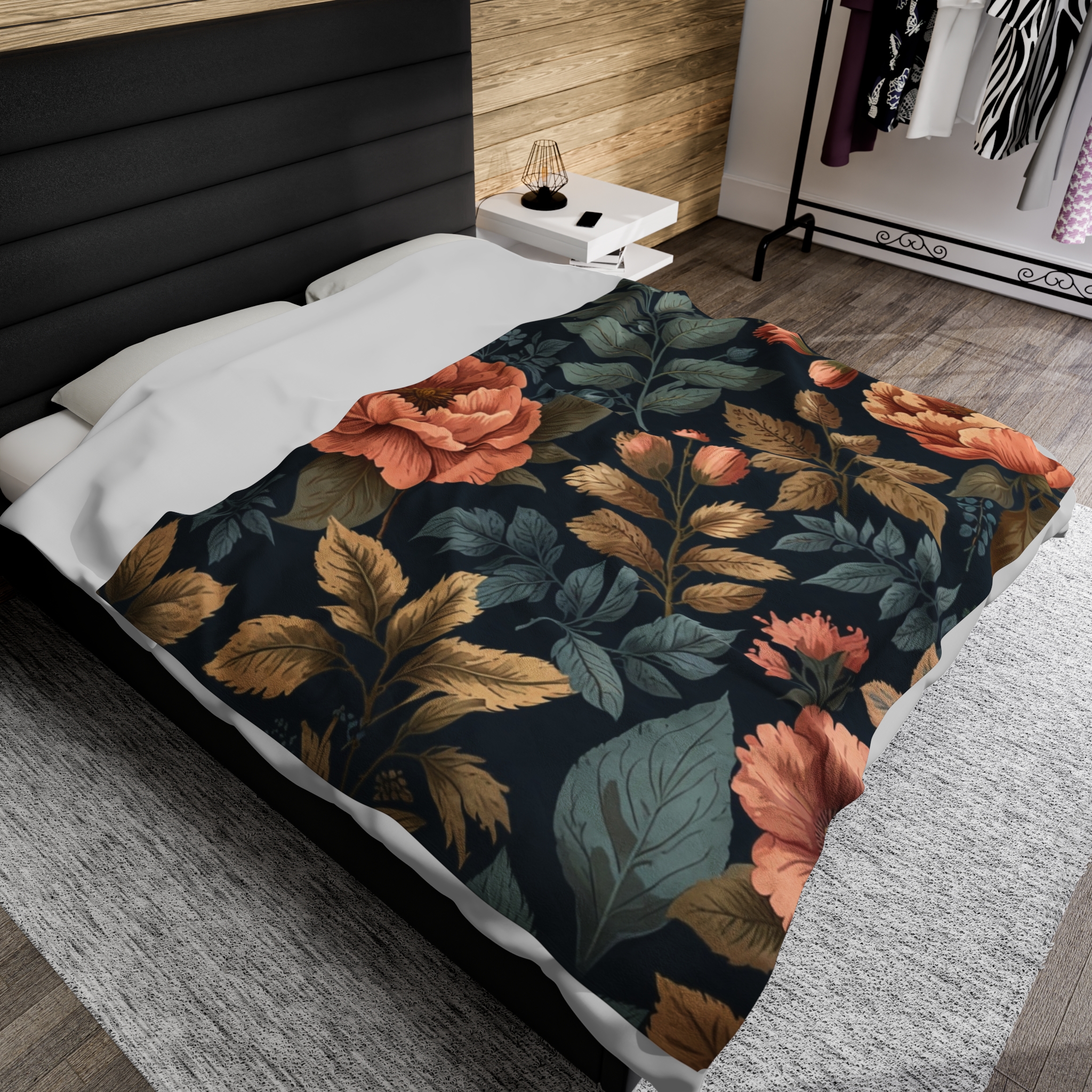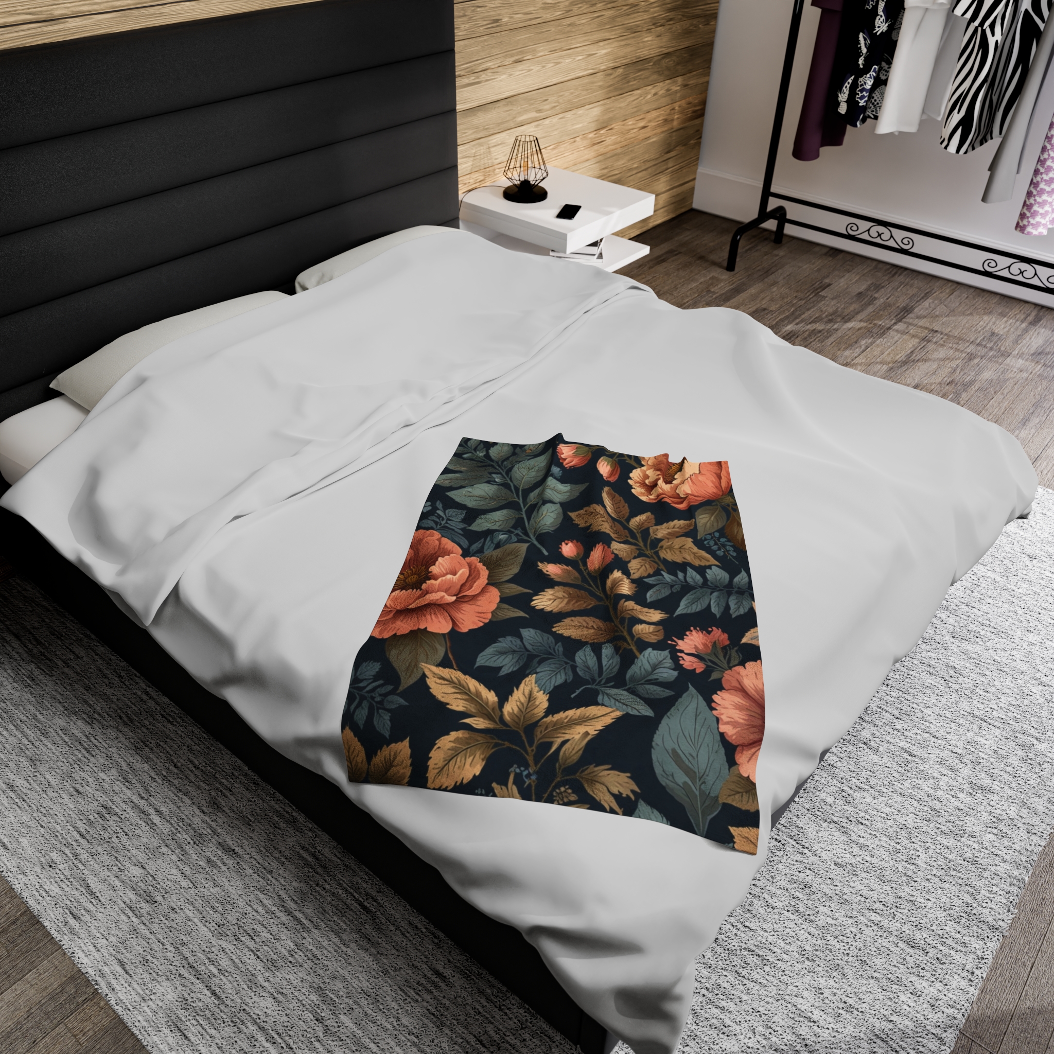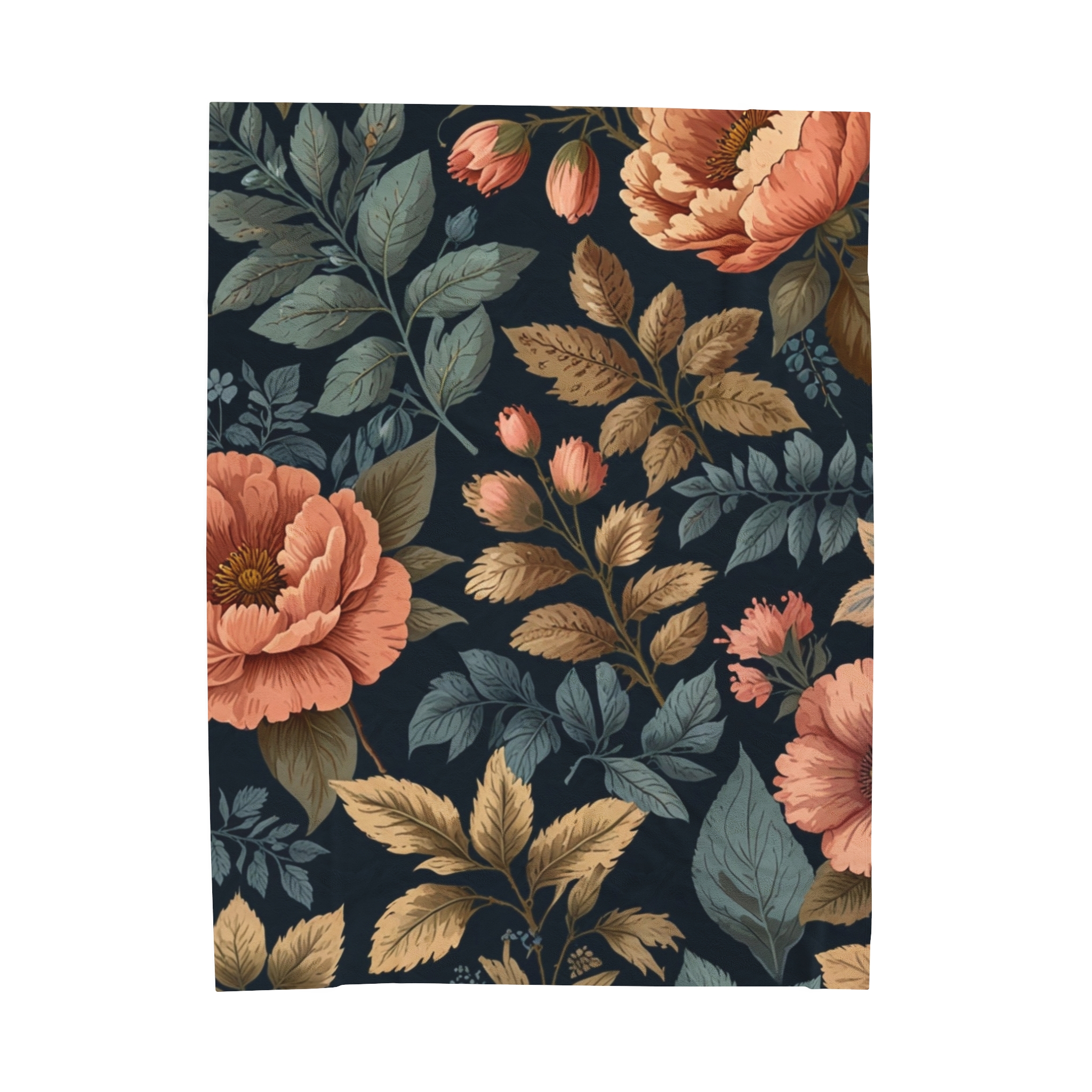 Velveteen Plush Blanket – “Gold, Green Leaves, Peach Flowers ” Design